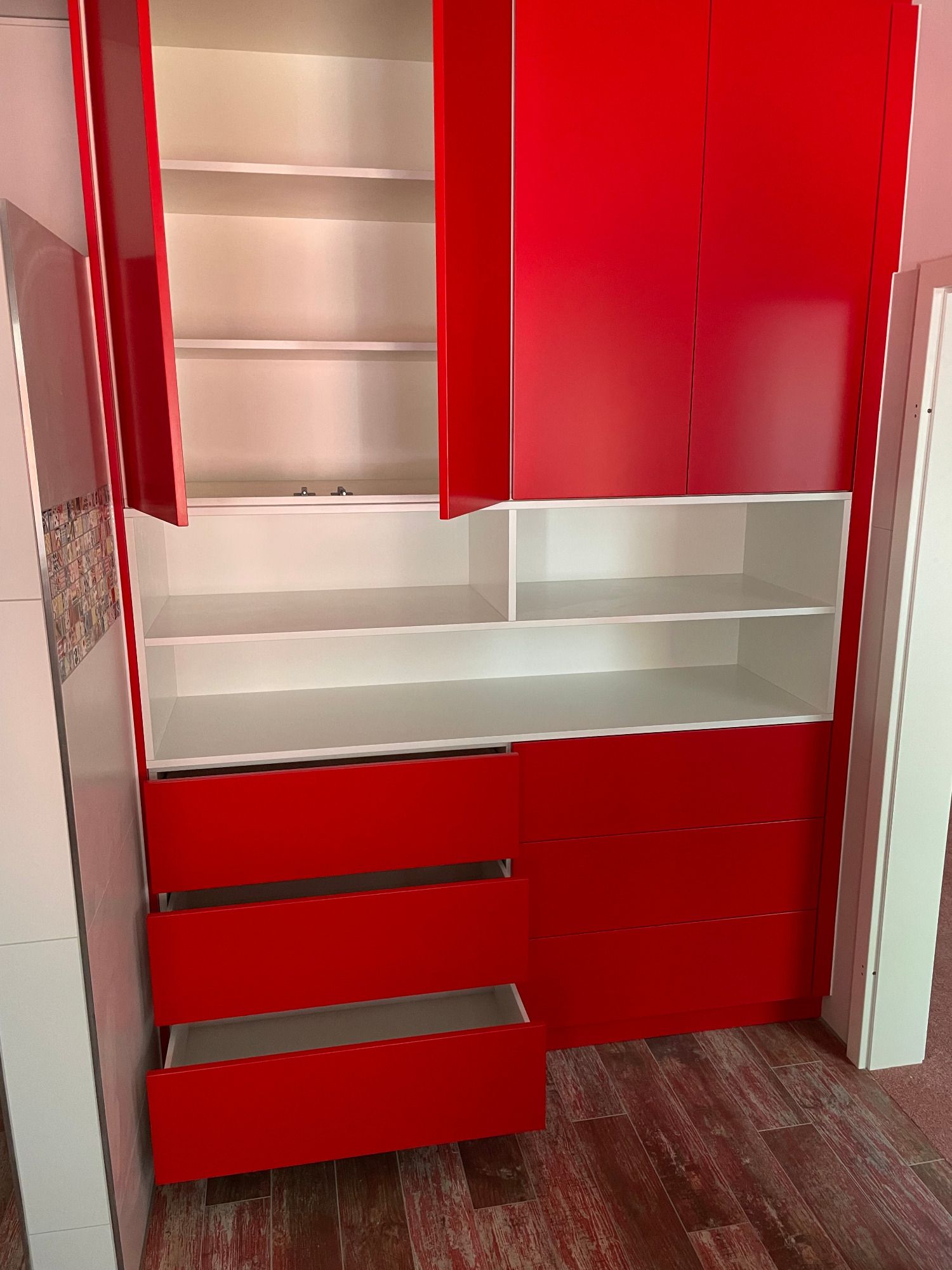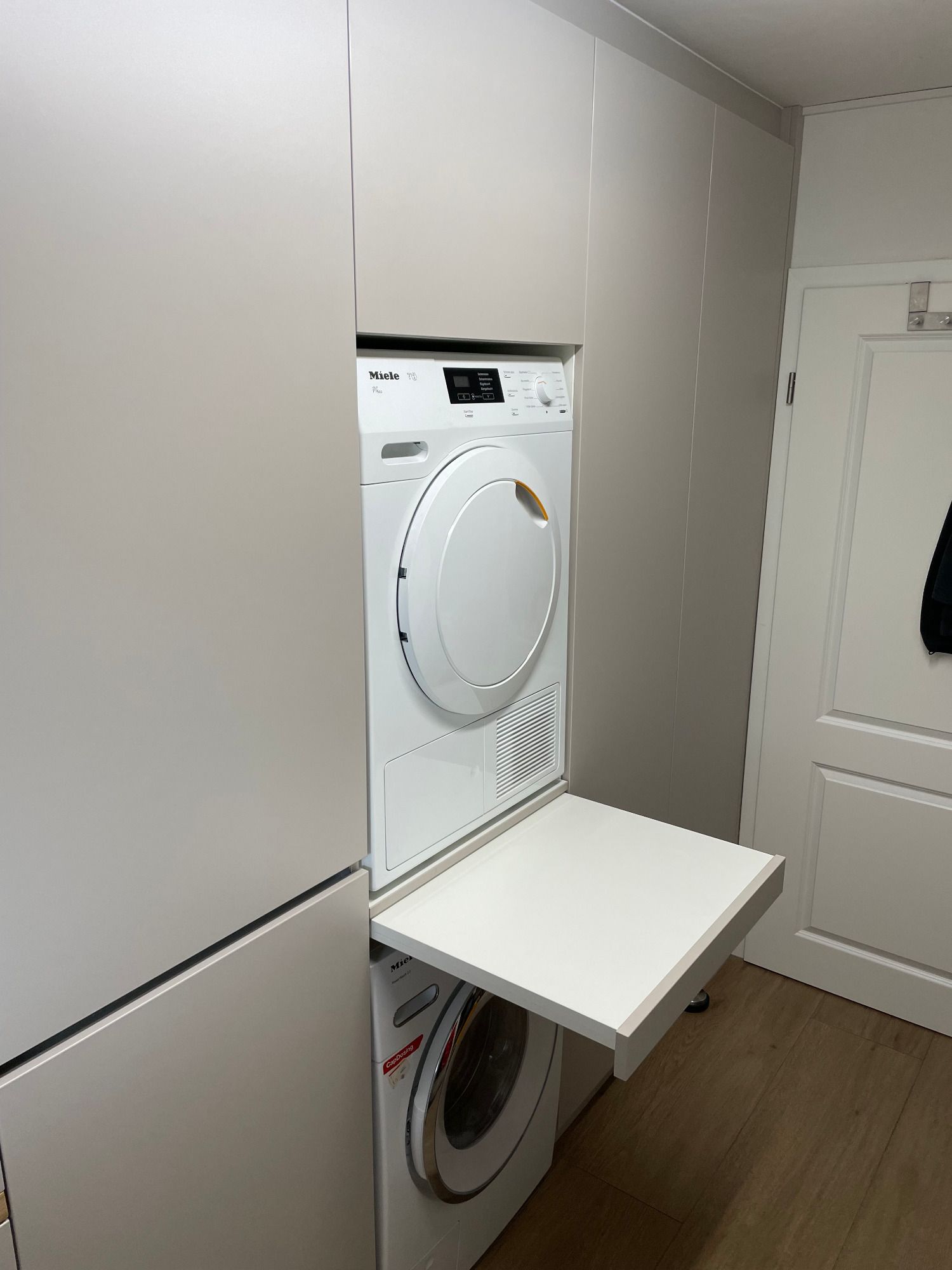 Korpus aus Dekorspanplatte - Grau Fronten aus MDF - Lackiert in Hochglanz Ausenseiten in Nussbaum mit einem Fach für den Saugroboter