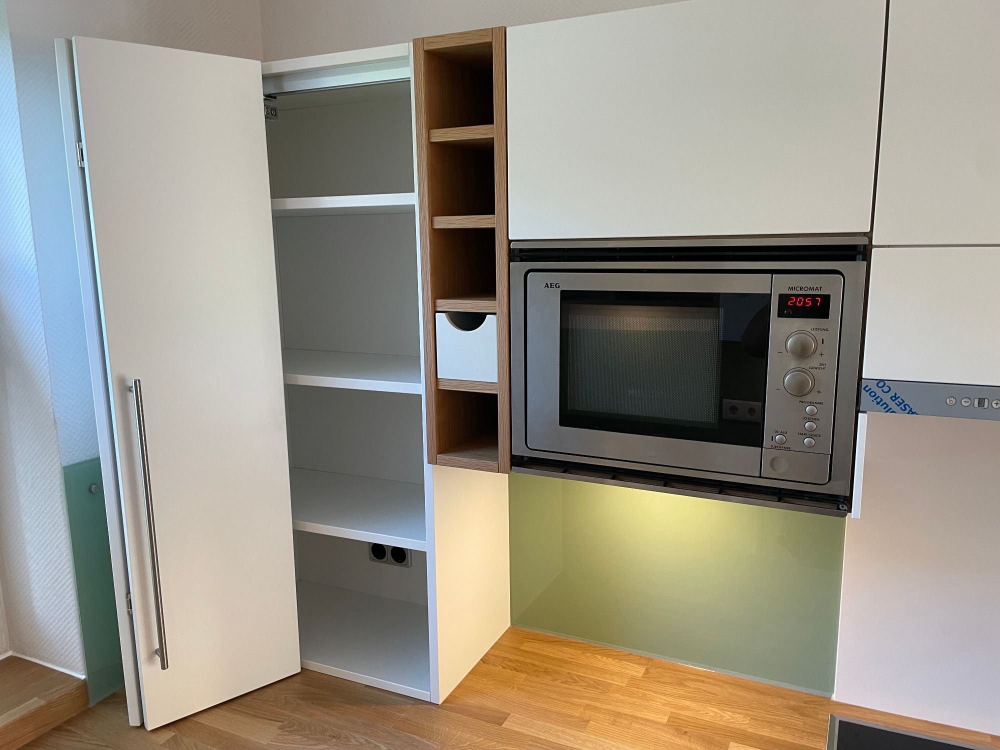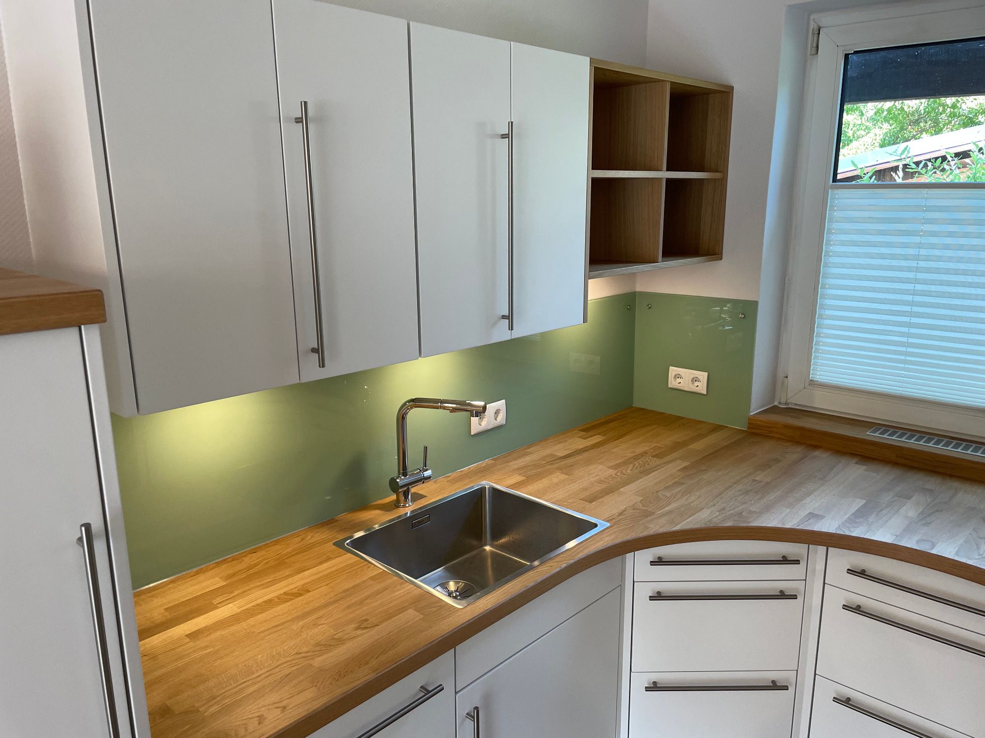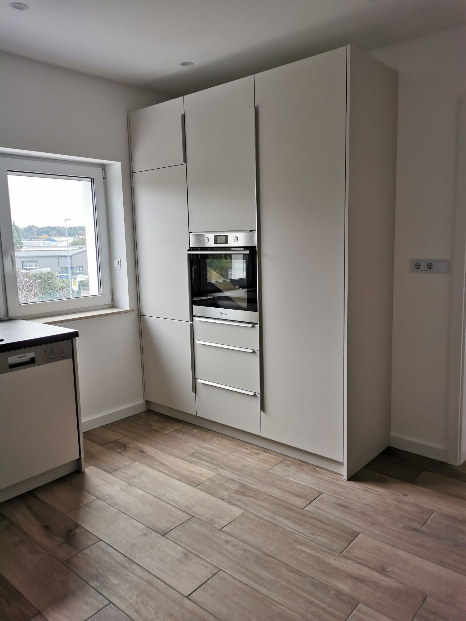 Korpusse aus Kunststoff weiß Fronten Lichtgrau - lackiert Arbeitsplatte - Eiche massiv - lackiert mit einem Einbaukühlschrank