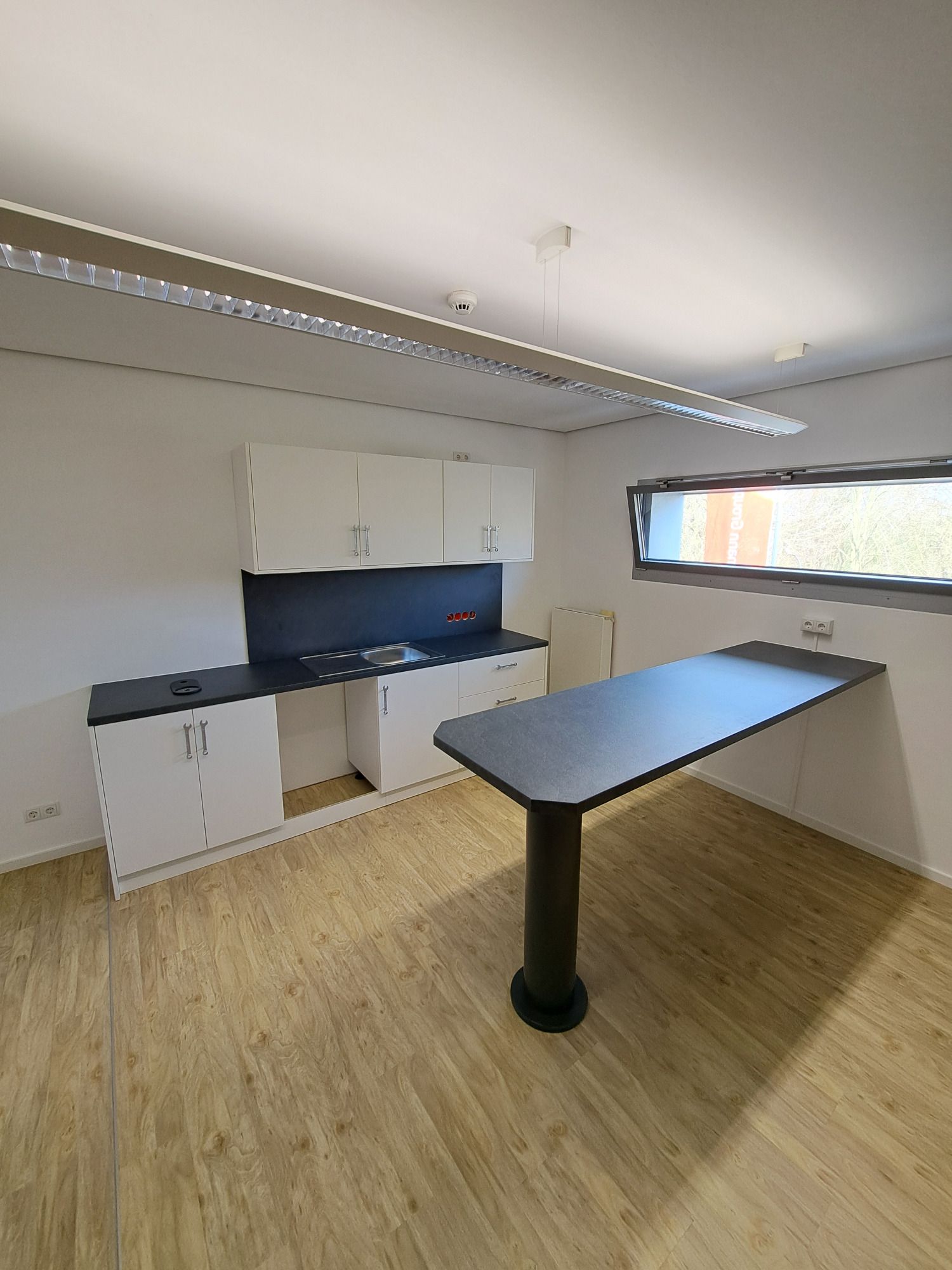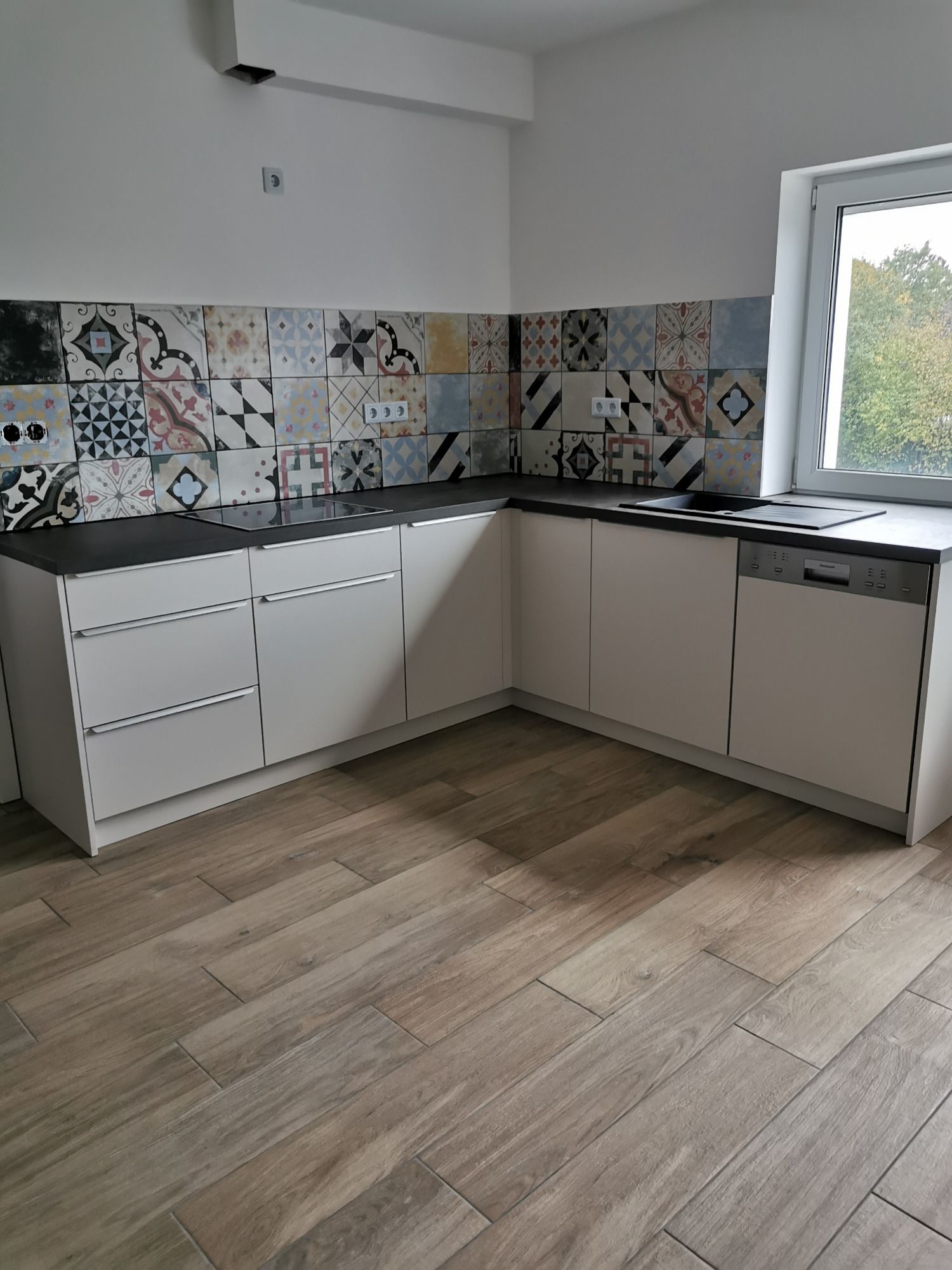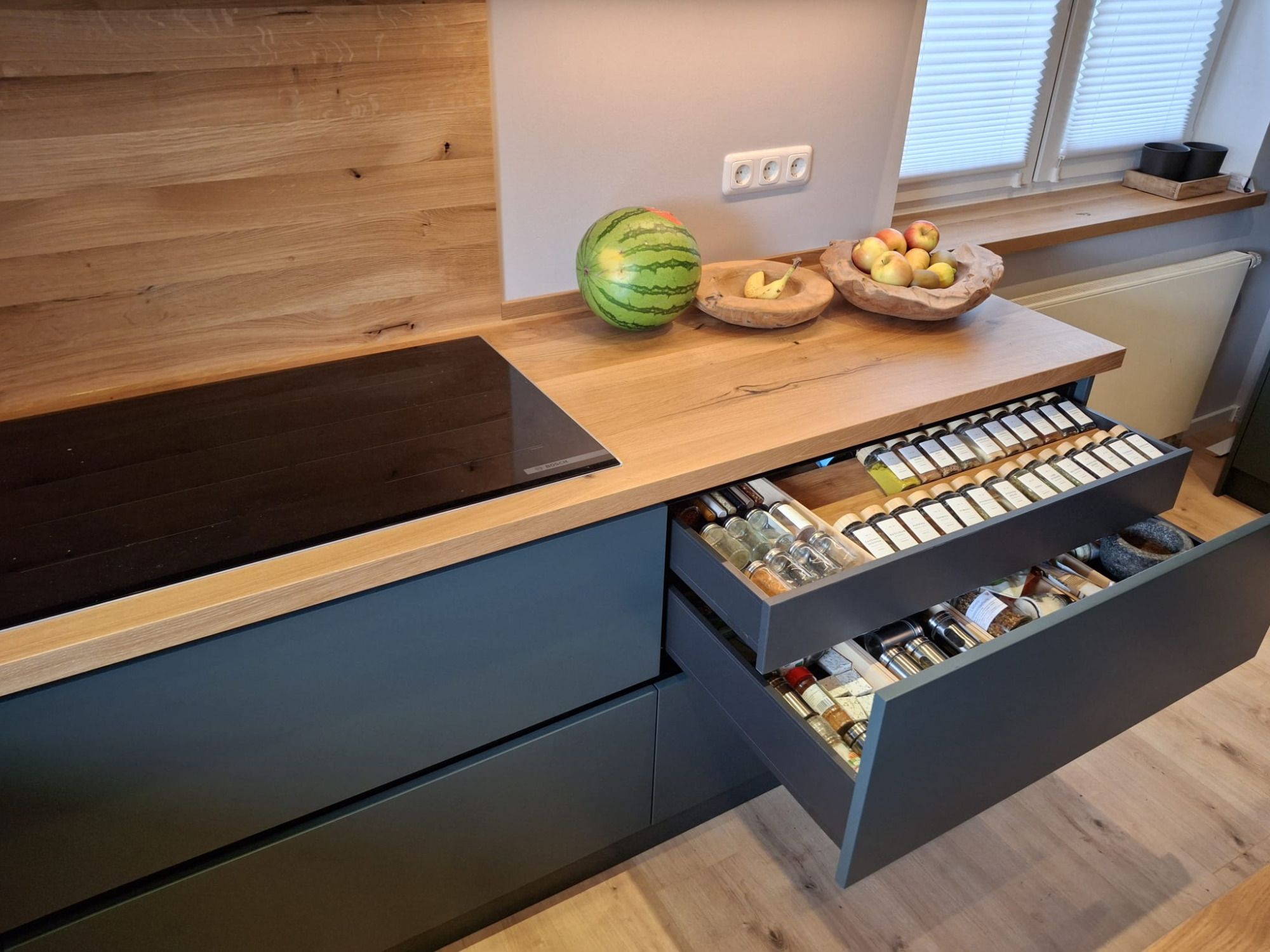 Korpusse aus Kunststoff weiß Fronten Lichtgrau - lackiert Arbeitsplatte - Eiche massiv - lackiert mit einem Einbaukühlschrank