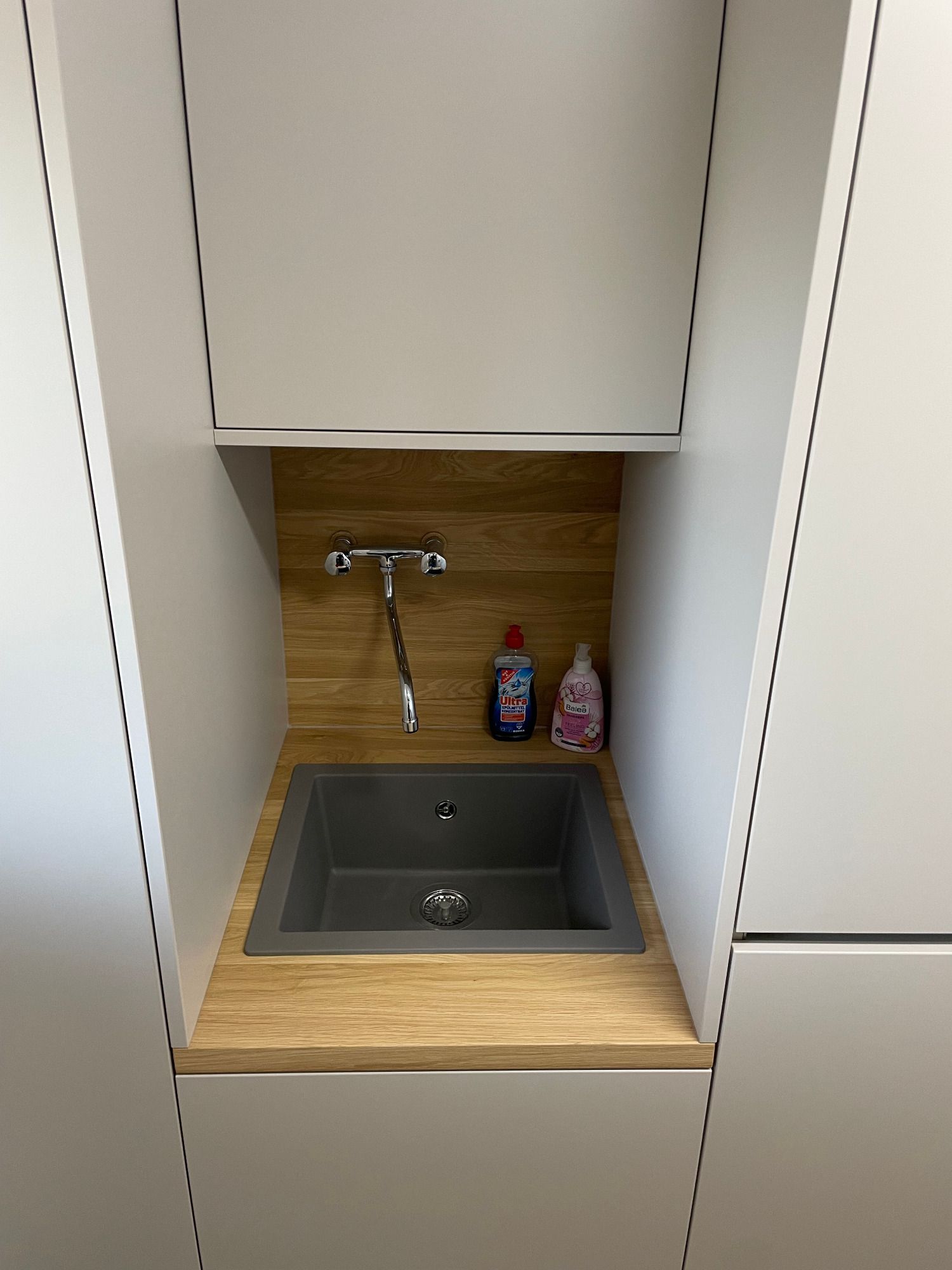 Korpus aus Kunststoff - weiß Fronten aus Kunststoff - Kaschmirgrau mit Einbauspülbecken und Eiche massiv - lackiert