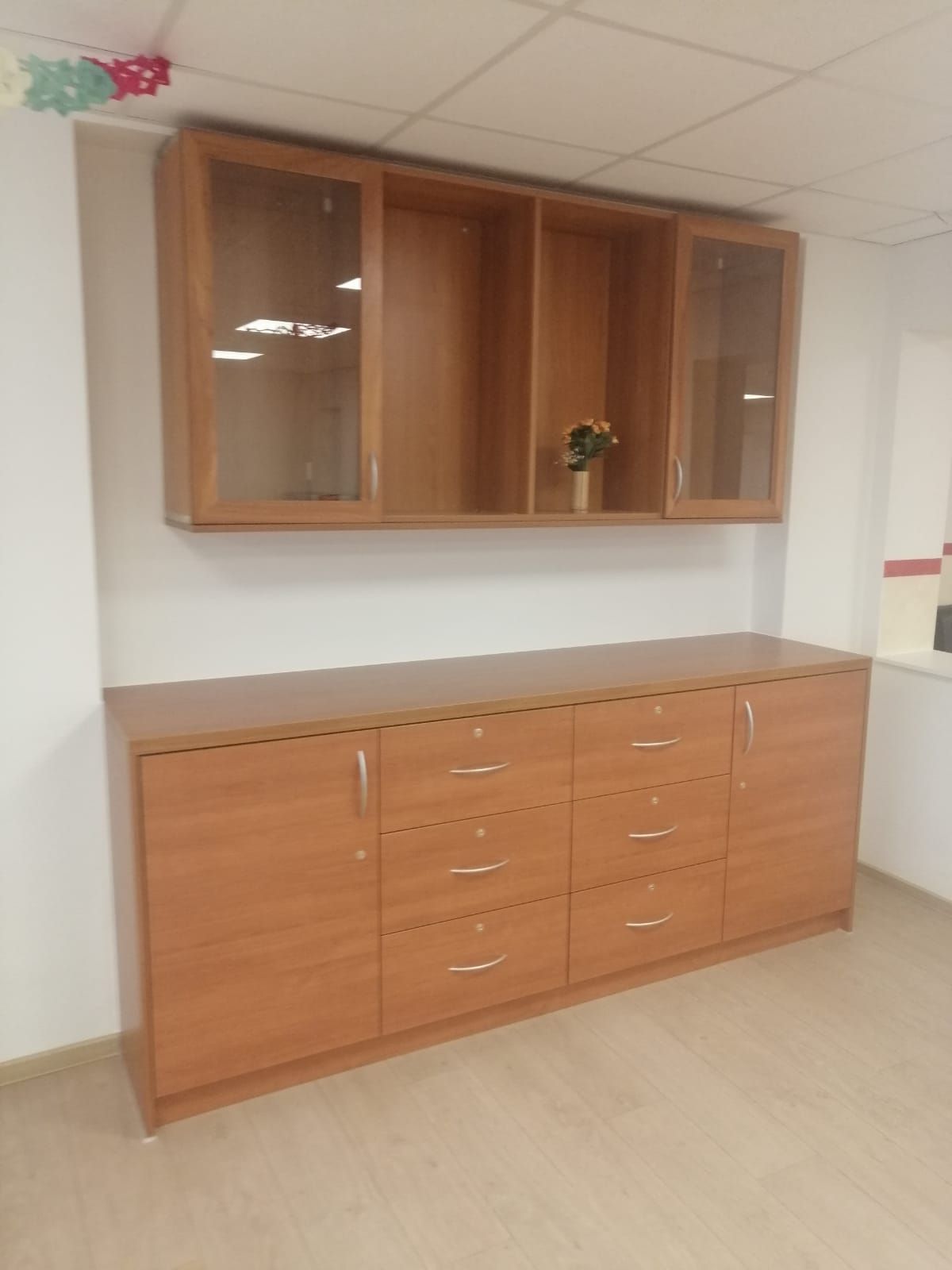 Korpus aus Dekorspanplatte - Grau Fronten aus MDF - Lackiert in Hochglanz Ausenseiten in Nussbaum mit LED Beleuchtung